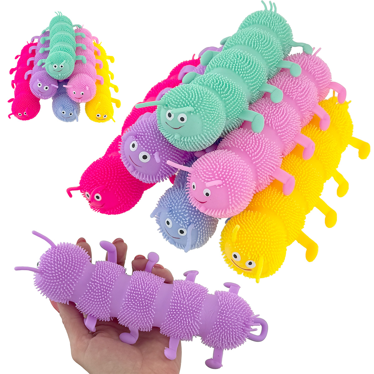 Яскрава антистрес-іграшка у вигляді гусені з м’якими шипами. Іграшка складається з п’яти гнучких сегментів, добре тягнеться та при русі створює веселий ефект. Під час удару або руху гусінь починає світитися та блимати різнокольоровими LED-вогниками, що робить гру ще цікавішою.